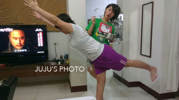電視裡的字幕跟JU妹敲鑼打鼓的動作很搭呀~~~