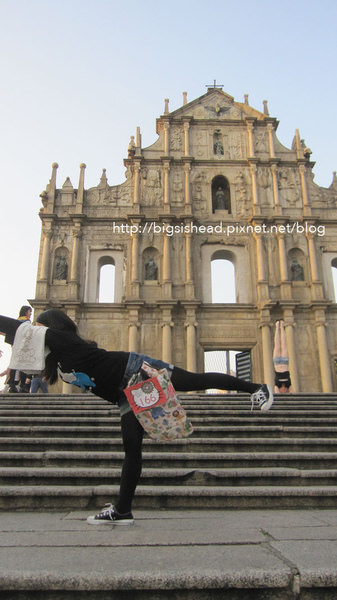 大家也知道,這大三巴牌樓基本上背景要清空是不可能的,除非你半夜來拍吧?!即便有比較少人的時候,大家也都是搶中間拍,我原本已經預備好動作,等老潘開拍時,後面可能又跑出人,再加上這動作真的很累,我拍到都快翻白眼了=.=