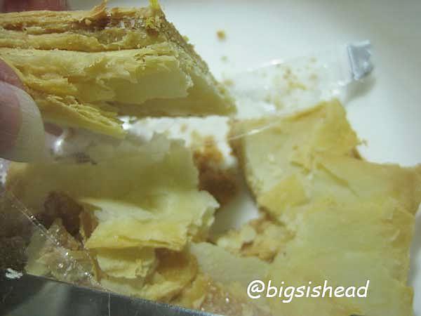 杏仁酥:這個我們在店家就有吃過了,上層是杏仁酥,底層就像是千層派,跟一般比起來是很紮實的千層派喔!但它碎掉了,不過是我的錯,因為杏仁酥怎麼可以用刀子切呢?那位天兵?!