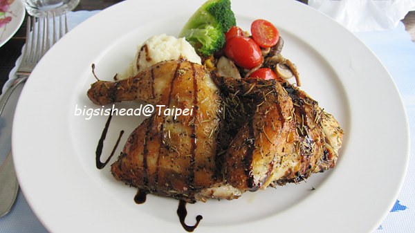 我點的迷迭香烤雞,實在是太好吃了!而且我原本以為是小雞腿排而已,沒想到來了半隻烤雞。下次有來的朋友一定要吃這一道,烤雞烤得很入味好吃,肉也很嫩,不會乾老,一旁的配料(馬鈴薯泥、花椰菜、小蕃茄及一些菇類)都是我愛的,這道菜會讓我衝動地想要隔天立刻去市場買雞肉來烤~~~