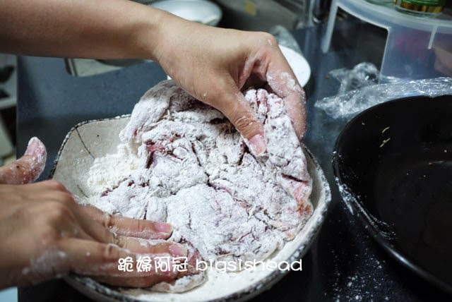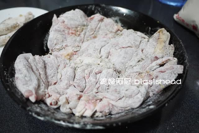 那天肉攤只剩下雞腿肉,老闆說不然就做雞腿排吧!有貼心地幫阿冠去筋並把肉切薄切大平面一點,但不知道是盤子太小還是肉實在太多縫縫了,塗麵粉的過程不太順利,還要把肉縫撥開來沾。
