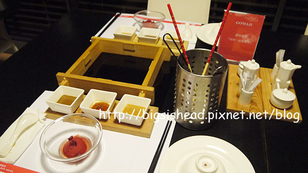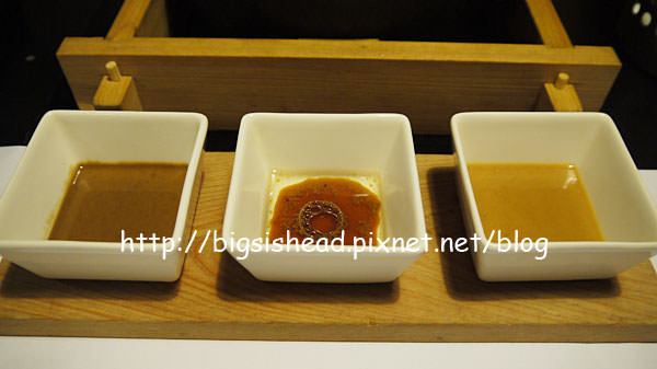 沾醬有味增、芝麻跟油醋吧?!我記不太清楚了,反正吃一吃人類的味覺就會自動選擇自己喜歡的味道去吃。