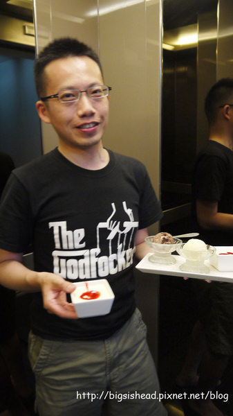 剛剛晚餐的甜點跟冰淇淋被我吃完了,所以老潘負責解決迎賓小蛋糕。