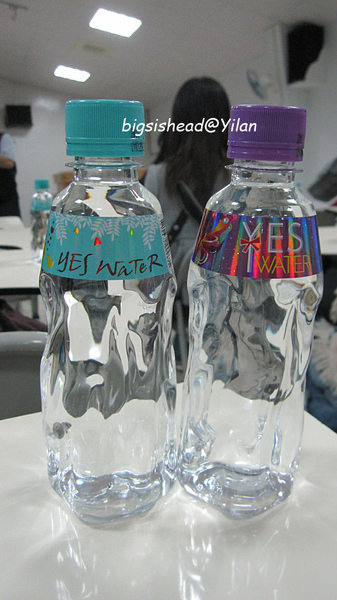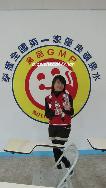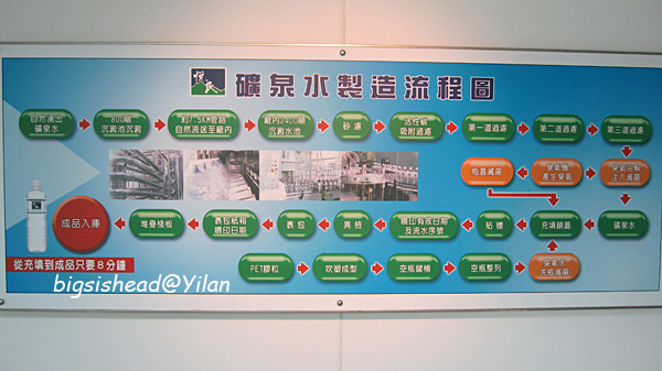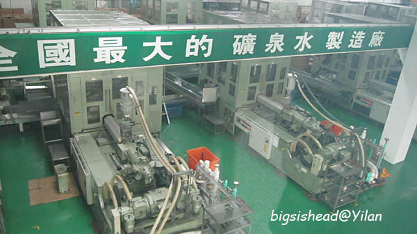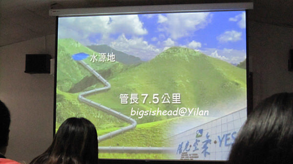 開始簡報囉!一些資料我會融入在底下照片說明裡頭,所有的簡報我只拍了這個畫面,因為水源地一定要純淨無污染沒有工廠或者人類居住造成生態破壞等等,可是工廠又不可能設置在很接近水源區的地方,因此這樣的兩廂矛盾一定得靠管線將水源引到山下,悅氏就花了7.5公里長的管線將水引到位於頭城工業區的工廠裡。能夠這樣豪邁的將管線牽下山是因為悅氏老闆原先從事紡織業,七零年代左右有一些資金,在朋友的建議下買了雪山水源地這個山頭,可是當時不知道要幹嘛,那個時代的人有自來水喝就不錯了,不太可能還”買水喝“,但是老闆的堅持,才能一路走到現在,否則在人民意識及環保意識抬頭的現代,光管路經過人家田裡的過路費應該會導致成本過高而放棄甚至是阻撓開礦泉水公司的意願。