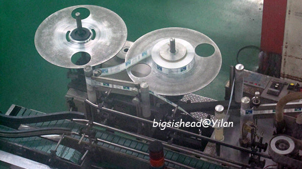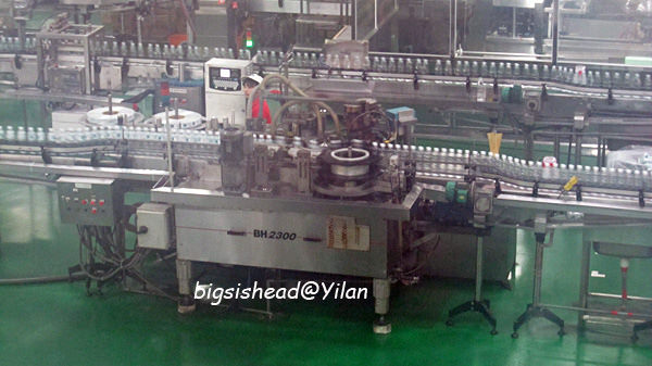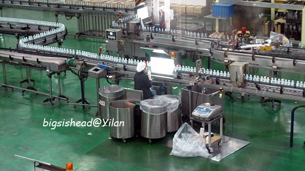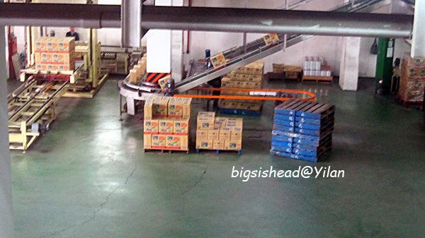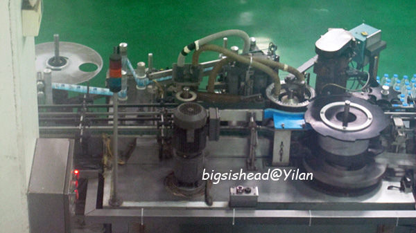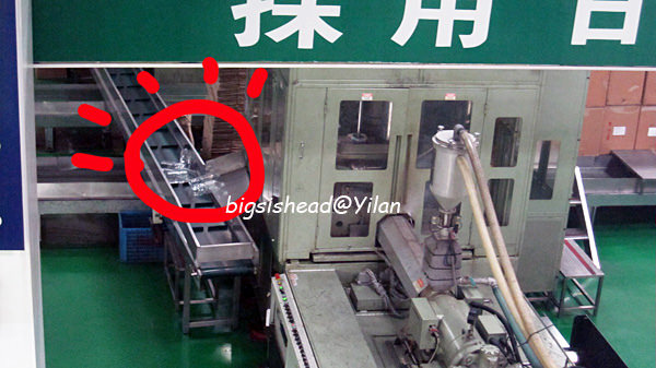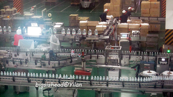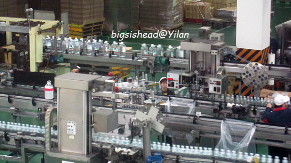 負責小瓶區的眼睛要轉很快,因為小瓶的咻一下就過了!可是後面大瓶區(6000ml)的速度就慢很多,因為需要人工扣上提環,雖然提環不環保而且多花人力在上面,但是因為市場上的反應還是需要有提環,不然客人去大賣場買了6000ml的礦泉水卻要抱回家的話,應該會被罵死。