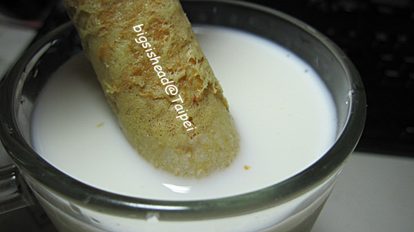 羊奶蛋捲與牛奶還是撐得上好朋友(握手~~~),而且阿冠好像也喜歡吃這種濕濕軟軟的口感,好極端喔!