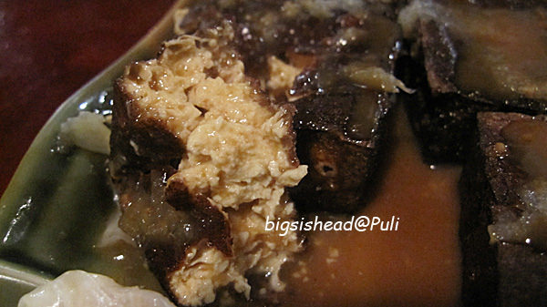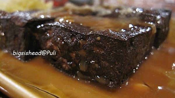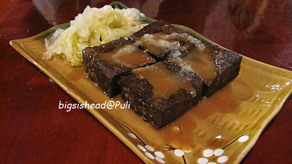 真的很黑皮喔!有點像滷過的豆干再下去炸…但沒有到很酥。店家是說先長時間熬煮中藥材,再將豆腐浸泡在裡頭,中藥湯汁滲透進豆腐之後再拿來油炸,可是我們吃的時候也沒有什麼中藥味,噱頭成分較多啦!