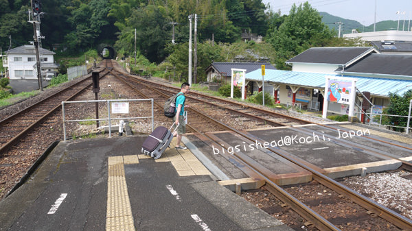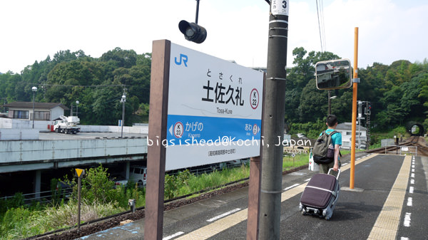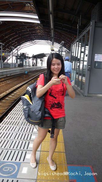 第二天我們搭車前往土佐久礼想要來享用道地的稻香燒鰹魚,因為這裡有間黑潮工房可以親手體驗稻香燒鰹魚的樂趣,所以拖著兩箱大行李,在這沒三隻小貓的無人小站大膽下車。驚喜之情溢於言表,下車後並不趕著出站,而是衝到車頭拍照。