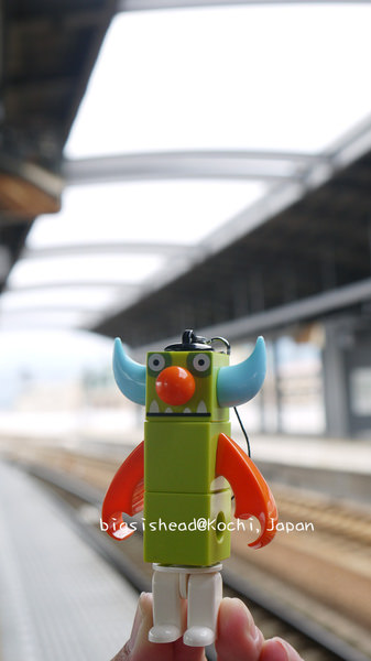 這時候,心血來潮請出角田戰隊出來拍照,結果被阿冠拆解的積木,其中一個傢私掉到軌道下啦!我腦子立刻浮現老師教過的常識:不可以擅自跳下軌道,這樣很危險,一定要請站務人員來幫忙…再加上我不想才到四國高知第二天就因為跑下軌道撿東西而上新聞,這樣太糗了!