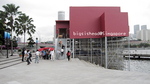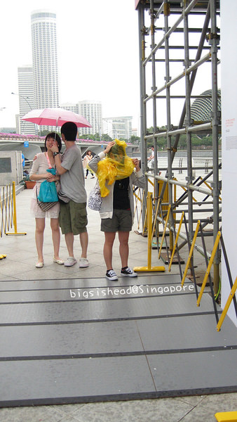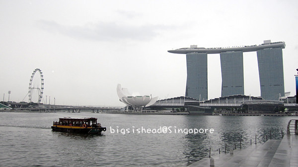 這個行程之後要去浮爾頓吃下午茶,擔心趕不上下午茶營業時間,再加上下了毛毛細雨,怕耽誤腳程,所以就搭計程車來到魚尾獅公園,一下計程車之後,我們直奔計程車司機說的魚尾獅公園。你可以想像兩個狂奔的女人,一到這個公園時,眼前只看到一座摩天輪、一個剝開的柚子皮建築物及飛在空中的金沙飯店,傻眼的互望,啊我們的魚尾獅勒?