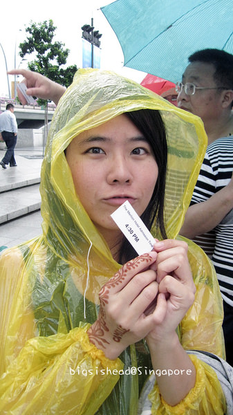 其實剛剛看到的人潮是要等著排隊進去參觀魚尾獅飯店喔!我們排隊時又下雨了,趕緊穿上我出國隨身攜帶的救命雨衣。