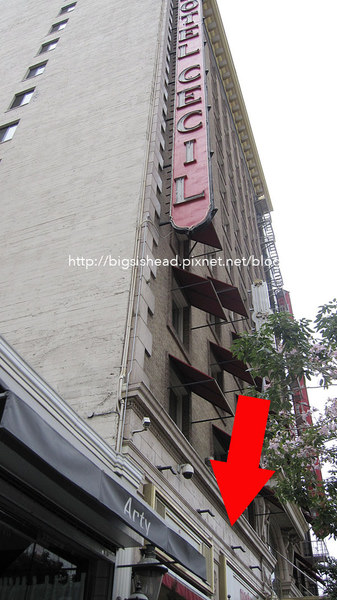 當天我們抵達洛杉磯機場後時候不早,在機場搭共乘車前往Stay on Main Hotel,司機載我們來到Stay on Main Hotel門口,我們倆個都傻了,發現Stay on Main Hotel簡直就是依附在Cecil Hotel咩!當初還選個老半天!紅箭頭處就是我們的Stay on Main Hotel,而剩下的一整棟都是Cecil Hotel。
