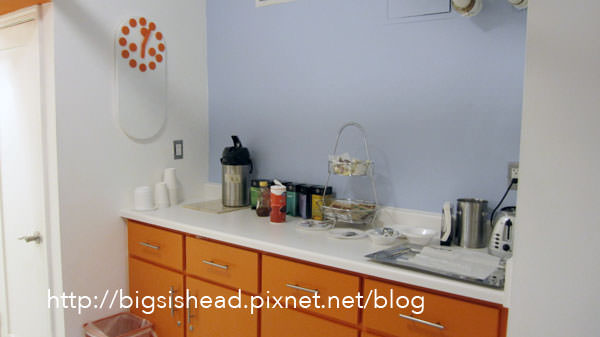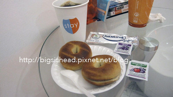 公共區還包括這個早餐吧,雖然每天都是重複很簡單的貝果加果醬,但我們都狂吃為的是撐兩餐省錢,回台灣後還是很懷念這邊的貝果,跟台灣吃到的不太一樣,也或許使因為我們在美國省吃儉用,貝果對我們來說就很美味了。