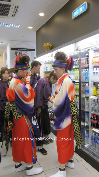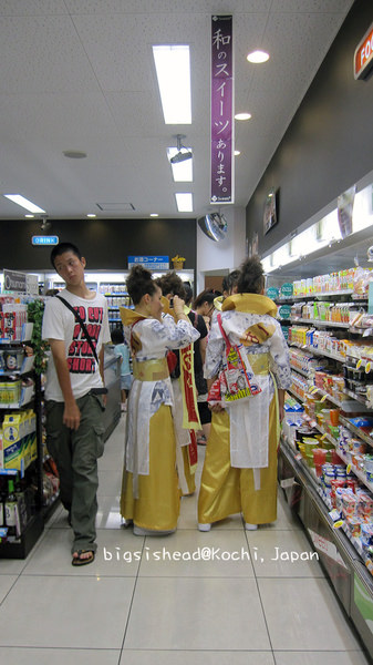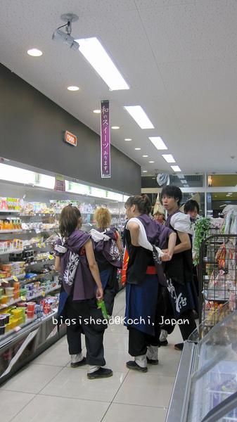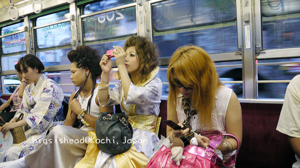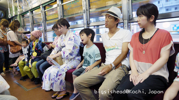 8/9早上我們換了JR車票、領麵包超人便當、搭MY遊バス(MY遊bus)去桂濱找坂本龍馬,回市區後,再搭路面電鐵到土佐電鐵的車庫去瞧瞧,從土佐電鐵車庫要回前夜祭表演場地的途中,看到很多表演者陸續上車,有的已經全副武裝,蓄勢待發;有的把握時間補眠;有的則把握時間補妝。