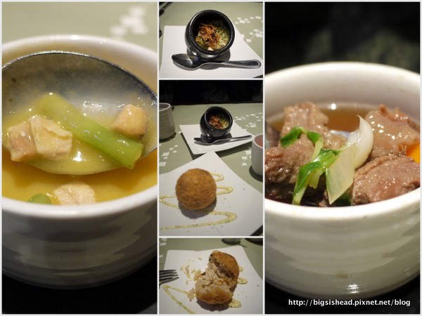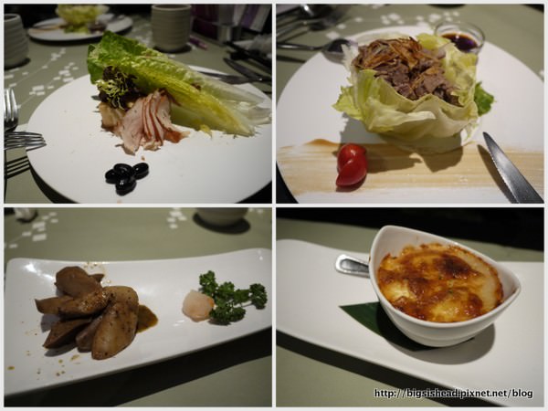 沙拉與前菜,整體都還不錯。老潘說燻雞沙拉的醬料不錯,碧綠牛肉沙拉則很像摩斯漢堡的燒肉珍珠堡內餡。前菜的杏鮑菇微辣,可是我很喜歡,香蘋海鮮燒我覺得台南東東宴會廳用真蘋果裝的略勝一籌!