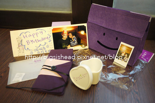 這是今天帶回的所有禮物:服務人員幫我們用公司相機拍照,快速沖洗做成一張生日卡片耶!超酷的!還送給壽星一個微笑面紙盒套;左下角的是入會禮:人文書卷收納袋,可以裝筆跟小冊子;右下角則是網路會員生日禮:樂讀小花盆,因為我不愛花花草草,應該不會拿來種花,最多會拿來裝東西,哈哈!