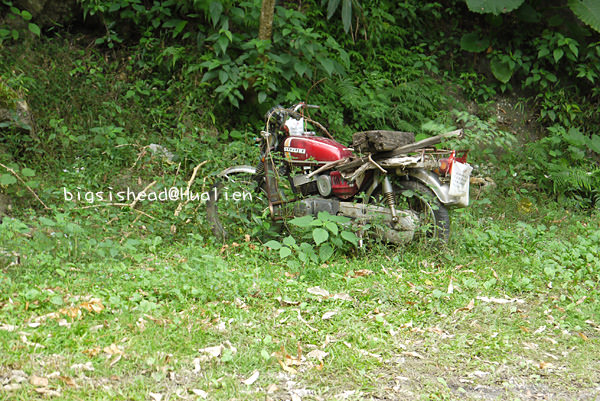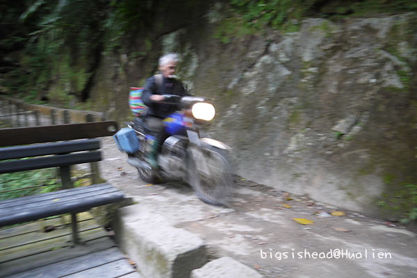 走下灰色的鐵樓梯,前方正是砂卡礑步道喔!不過,你可能會發現怎麼有一些機車停在這呢?因為砂卡礑步道還有一些原住民住在裡頭,從部落出來需要一段時間或者有時需要搬運農作物,所以他們用天車吊了摩托車放在百獅橋下當交通工具,往返部落與橋之間的路段,再走上橋搭公車到其他地方。