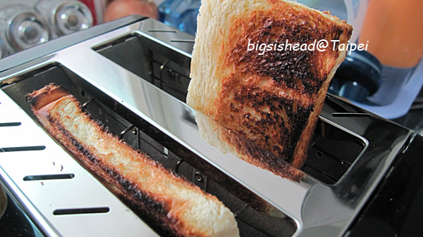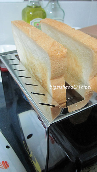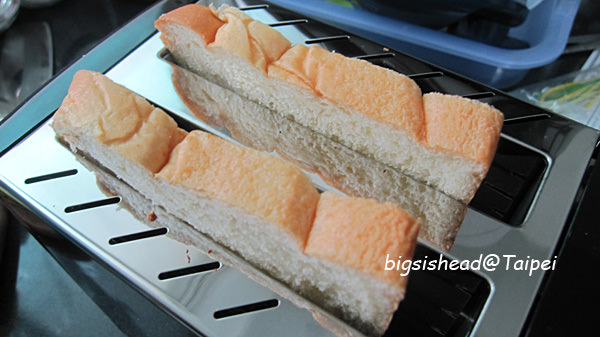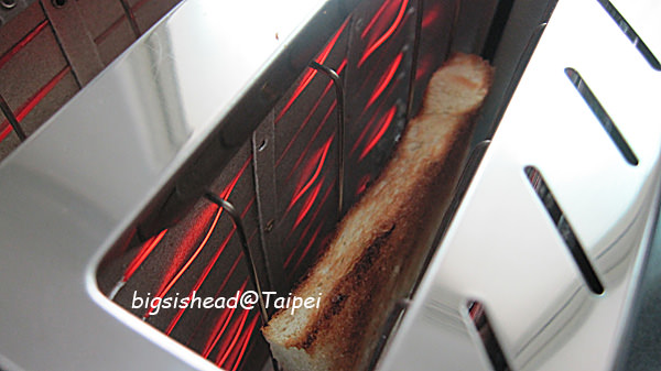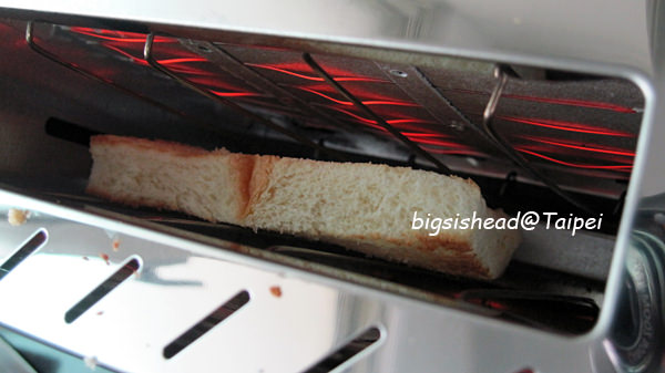 剛剛土司切完之後,土司變好小一塊,根本不用壓把手,整塊就已經在土司機的烘烤範圍裡了。