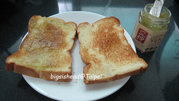 後來發現這樣浪費下去也不是辦法,已經可以預見下地獄要吃好多東西呀!所以我阿冠咬了一口第二份失敗的土司,發現其實沒有燒焦的苦味,還蠻好吃的耶!那就省一點,吃吃看!(這種煮婦過於勤儉的行為不可取,燒焦的食物還是少吃喔!尤其是孕婦。)