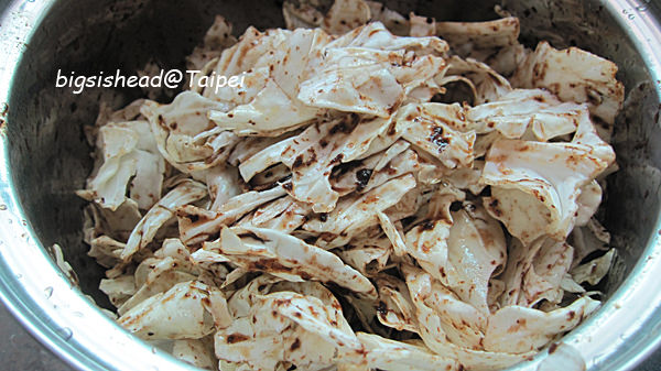 經過一晚之後,高麗菜已經出水,消水得更明顯,已經能均勻的泡在湯汁裡頭。