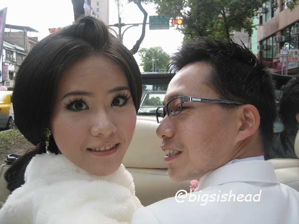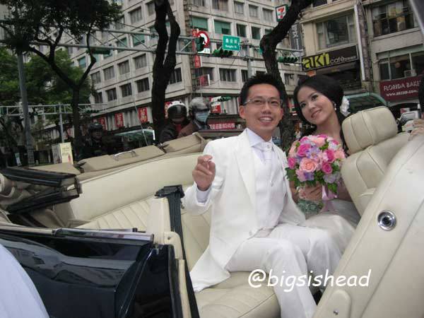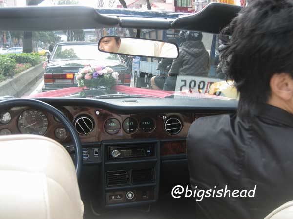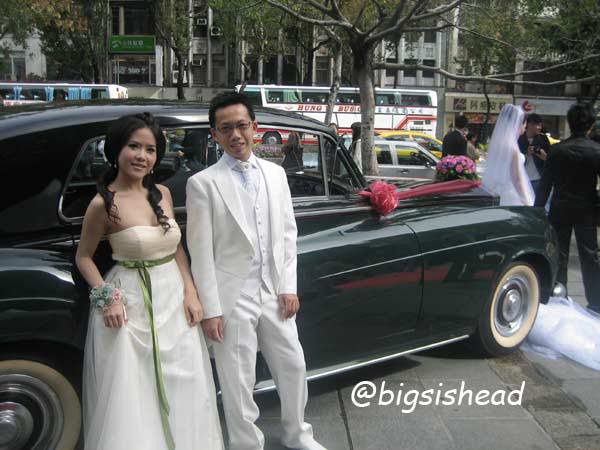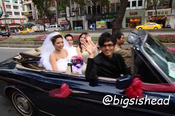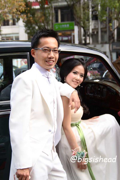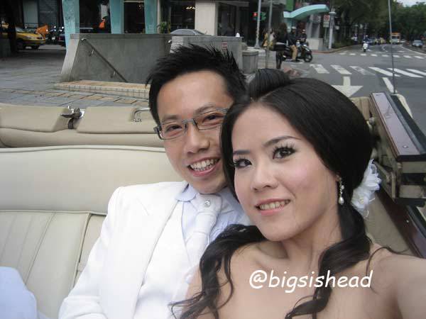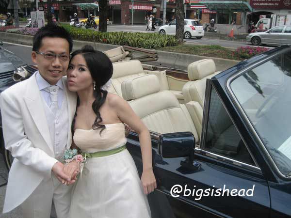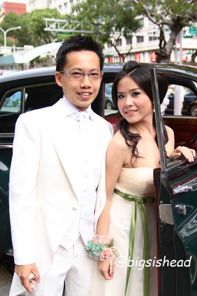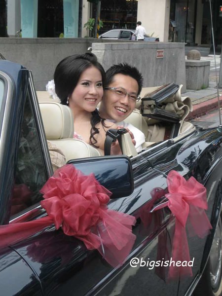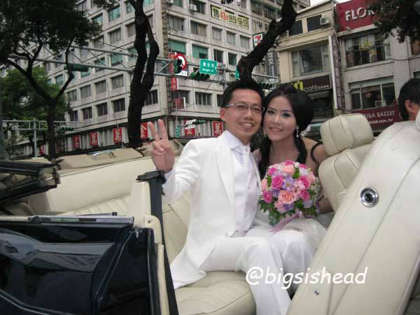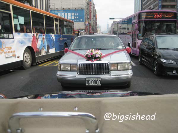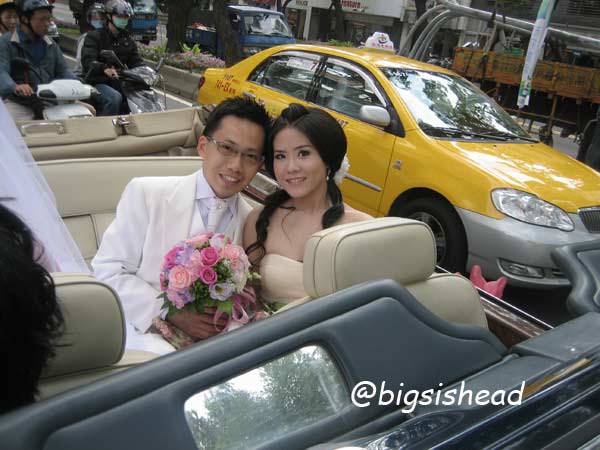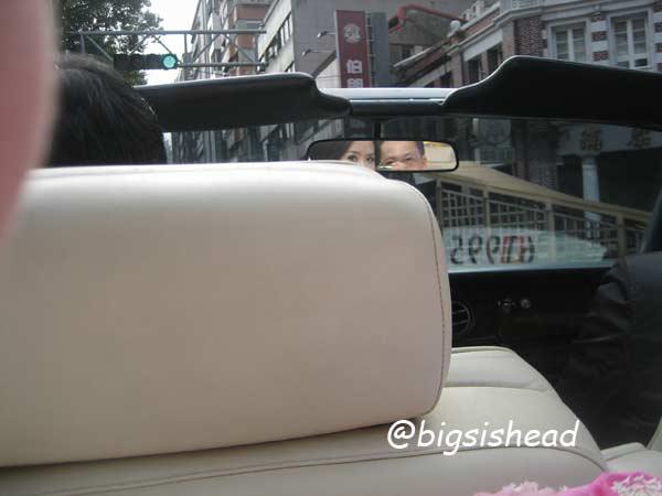 另一對新人的新郎自願坐前面,所以我跟老潘先上車,而且我的禮服實在太輕便了,其他人都一大陀,行動不便,我很輕易就跳上車了!