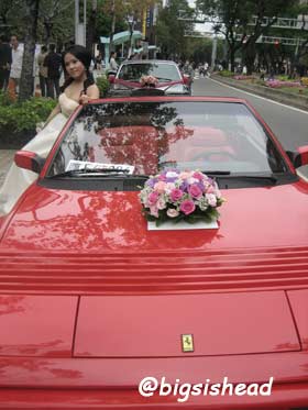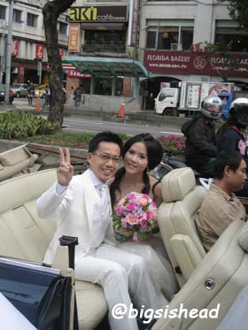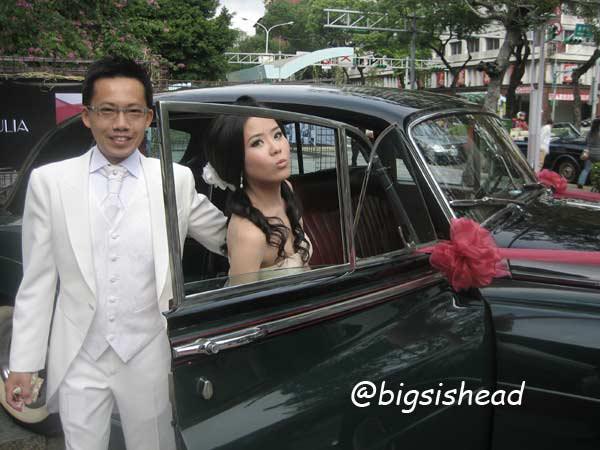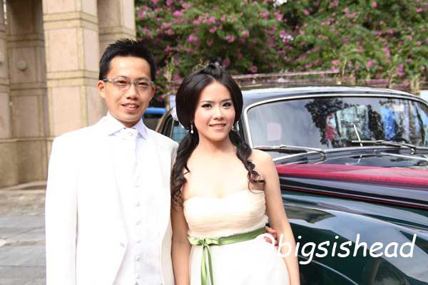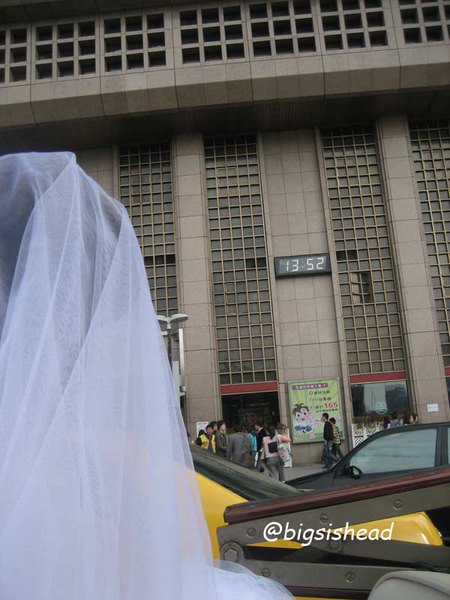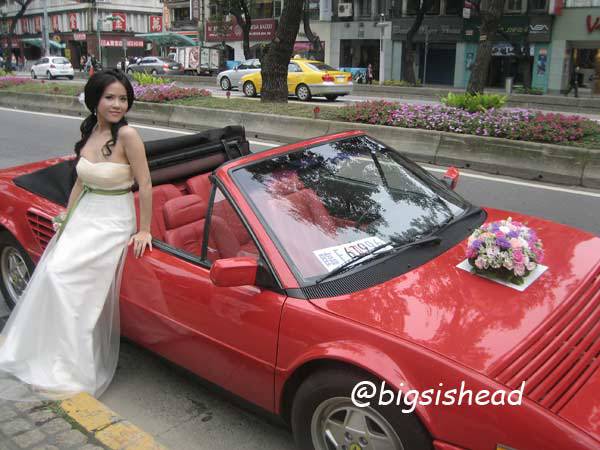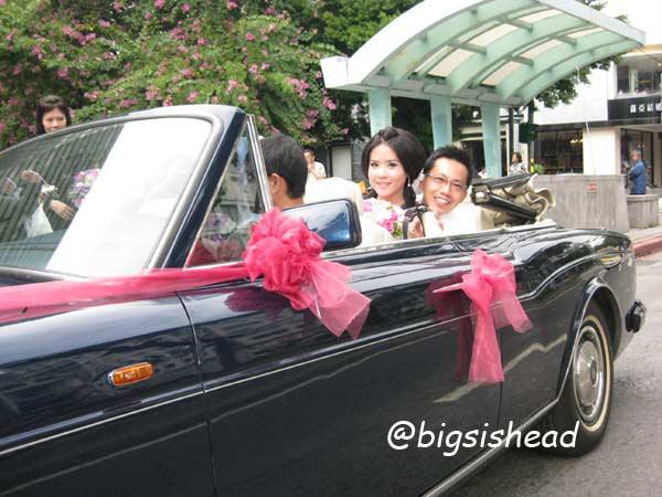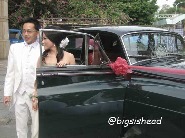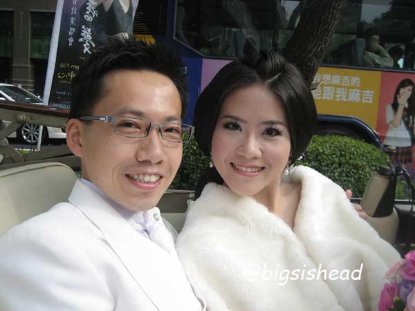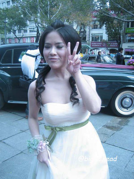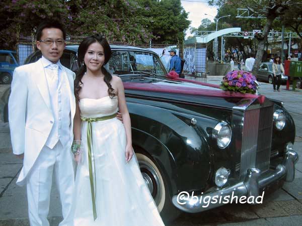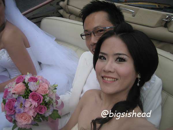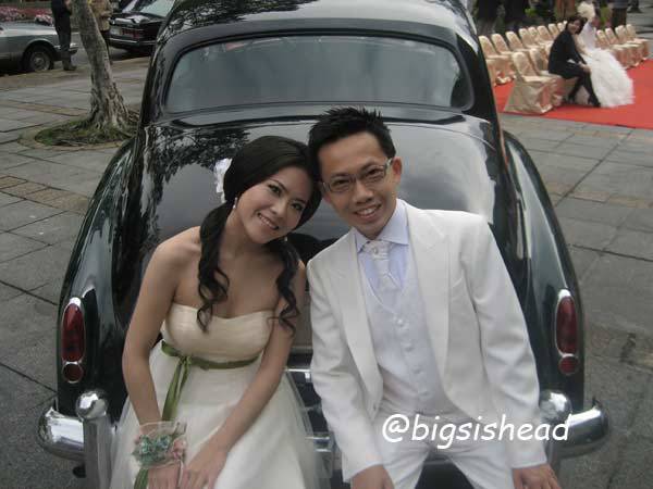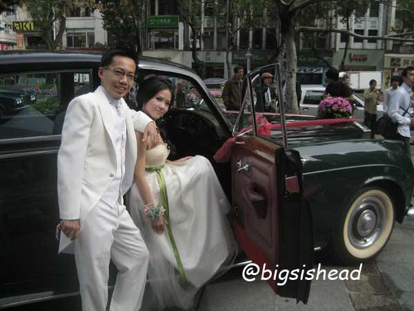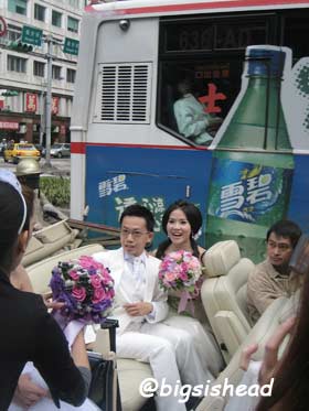 另一對新人的新郎自願坐前面,所以我跟老潘先上車,而且我的禮服實在太輕便了,其他人都一大陀,行動不便,我很輕易就跳上車了!