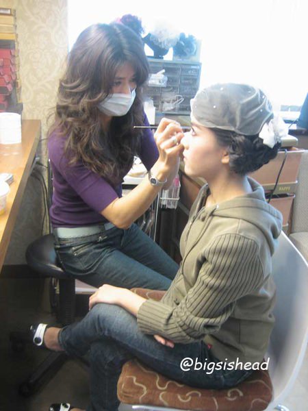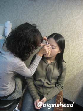比賽是中午12:00左右開始,所以我們10:30到婚紗公司報到,準備化妝。一開始先由我拍婚紗的造型師幫我打底妝,再來由資深的造型師接手,整個化很濃的舞台妝。