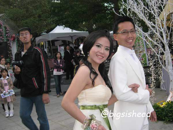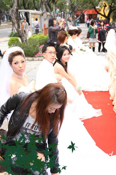 這張照片有好多故事要說喔! 第一,大家都盛裝打扮,當下覺得,我們真的是來拿參加獎餐卷跟照片而已,得獎想都別想;第二,我隔壁那位新娘有明星臉耶;第三,很多綠色楓葉是因為攝影師拍到不該看的東西,而且超明顯的,我把它擋起來了。