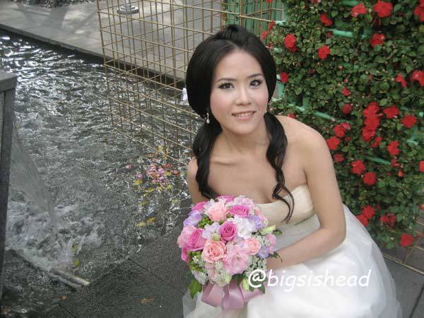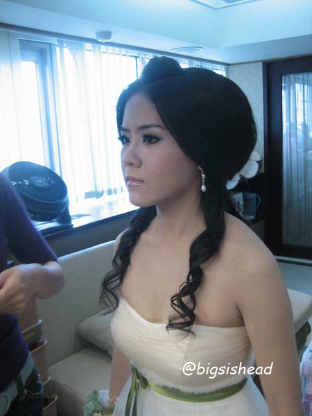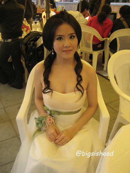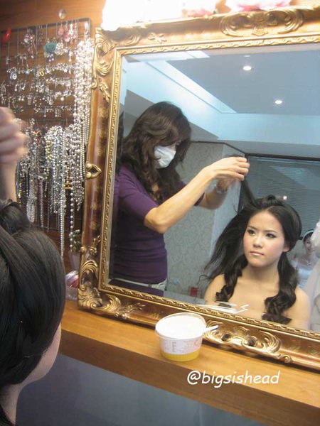這是一開始做的造型,也是唯一一張照片,原本想說反正之後會拍很多照片,所以做造型的時候就沒有認真拍。結果,造型做好要問老闆娘該穿哪件禮服的時候,老闆娘看了我的造型就跟造型師說:阿ㄋㄟ甘好?然後造型師在我還沒來得及阻止她拆掉飾品讓我拍照的同時,已經整個把我頭上的東西扯下來,後來才知道,老闆娘不喜歡現在很流行在頭上戴帽子或裝飾品的造型,老闆娘喜歡典雅貴婦的fu,好吧!我從沒嘗試過壓根不是我style的貴婦名媛風,有這免費經驗也不賴,雖然我還是看第一個造型比較順眼,但這是比賽,老闆娘應該有她的獨到見解。