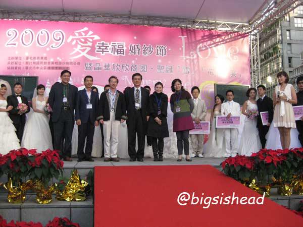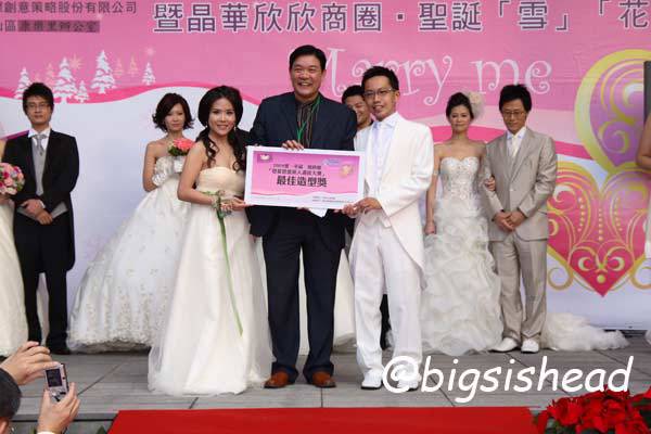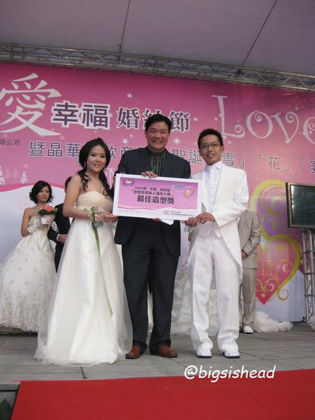 所有得獎者拍照留念,依序為:最佳婚紗獎、最佳造型獎、最佳攝影獎、恩愛恩愛新人獎及天生絕配獎。我阿母說我們會得最佳造型獎應該是因為我們是裡頭最簡約的新娘造型,在一堆造型誇張的新娘裡頭,我們反而勝出,不然我個頭這麼小,在一堆新娘群裡只會被淹沒。所以當時老闆娘讓我穿這件禮服,做這樣的造型,應該就是逆向操作吧!