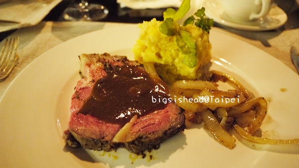 主菜來囉!美國爐烤牛肉,一上桌我嚇了好幾跳,怎麼這麼大塊啦!看了就好撐…但薯泥及炒洋蔥很好吃,大推!