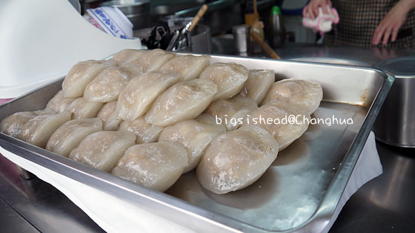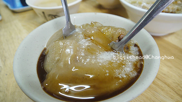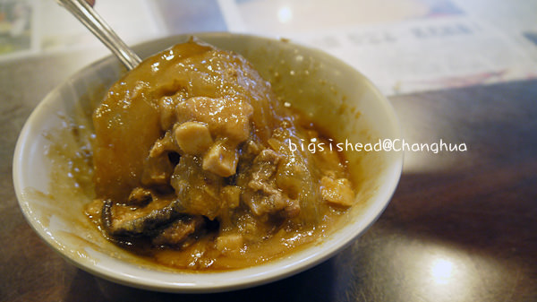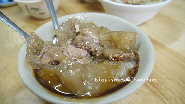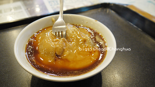 我這輩子第一顆彰化肉圓就獻給了阿璋肉圓(35元/顆),原來這醬汁的味道跟台南孔廟對面莉莉冰果室隔壁的福記肉圓有點類似,裡頭也是整塊的肉塊,不像清蒸肉圓是肉臊,但我覺得福記肉圓特別的地方在於他的外型跟醬汁都像是在吃彰化肉圓,但是做法是清蒸肉圓的作法,所以我敢吃。