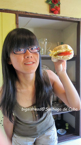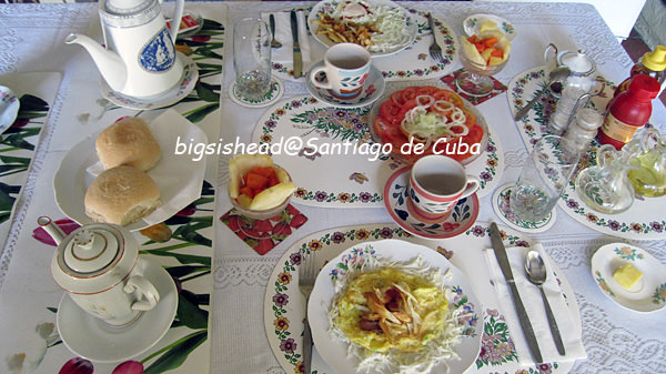 今天的愛心早餐,看起來沒有很多,但我們吃到肚子快爆炸,還得先回房休息一下才有辦法出門。前一晚Vilma會問說要哪種型式的蛋,我每天都吃Tortilla(其實就是西班牙的Omelette),老潘每天吃荷包蛋(因為我不會講荷包蛋的西班牙文,只說like a sun她就聽懂了),每人會有一份蛋、各一份水果、各一塊麵包、一份沙拉盤及咖啡/茶二選一,因為位處於相對離台北遙遠的台灣屏東,Santiago de Cuba的民宿比較難經營,所以早餐已經含在住宿費裡頭,每天都吃得很撐,最後我們都把麵包帶出去當午餐,配瓶可樂及水,也可以解決一頓,省了很多錢。
