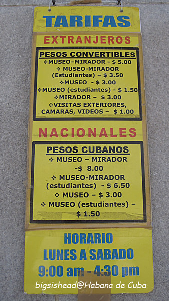 我還是要再解說一下拍這張圖的含意,外國人參觀博物館並且搭乘電梯上塔觀景5CUC(新台幣155元),學生3.5CUC(新台幣108.5元),只有參觀一樓的博物館3CUC(新台幣93元),照相機或錄影機要多加1CUC(新台幣31元);古巴人參觀博物館並且搭乘電梯上塔觀景8pesos(新台幣9.6元),學生6.5pesos(新台幣7.8元),只有參觀一樓的博物館3pesos(新台幣3.6元),學生只有參觀一樓的博物館1.5pesos(新台幣18元)。