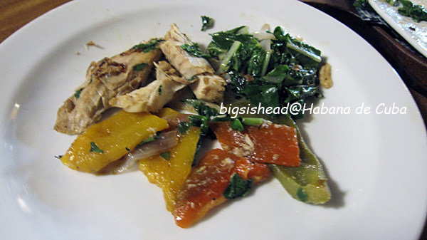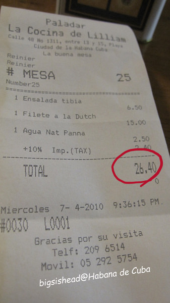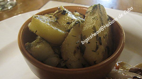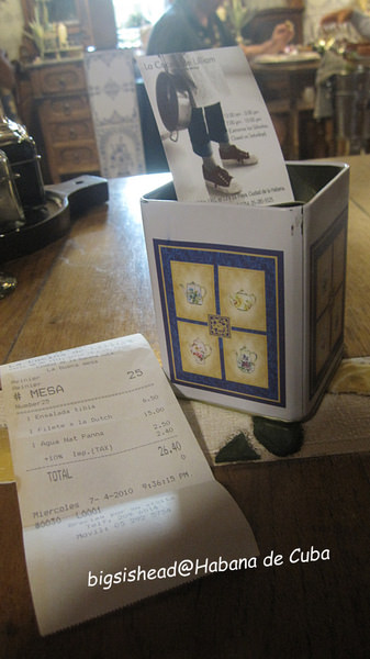 這家餐點很好吃,值得推薦,店裡很多是預約客,感覺大家都熟門熟路的。剛剛說可能是遊走法律的邊緣是因為古巴政府規定私人餐館不能超過四張桌子,但這間的桌子大約有14張吧!而且一般都會先預約,因為生意很好,東西好吃,服務到位,只是價格比較高一些。但我們在古巴哈瓦那餓了好幾天,要離開哈瓦那之前終於吃一頓稱得上是dinner的晚餐也不為過啦!(26.4CUC)