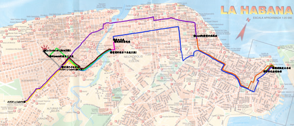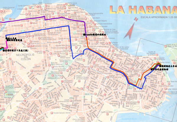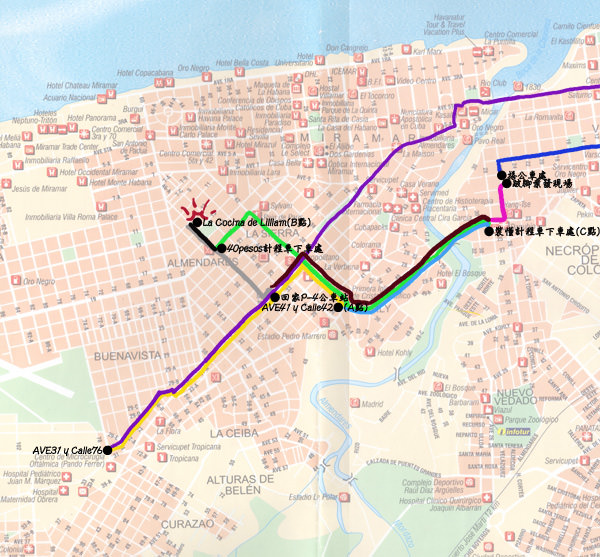 藍色線:搭27號公車到圓環隧道公車站,紅色線:從公車站走到革命紀念博物館,綠色線:從革命紀念博物館走到公車站,橘色線:搭27號公車到copelilla轉車,紫色線:搭P-5公車路線到AVE31 y Calle76,黃色線:搭222公車到AVE41 y Calle42,淺藍線:搭裝懂計程車回casa附近(C點),蘋果綠:搭40pesos計程車路線,黑色線:走進高級餐廳路線,灰色線:走出高級餐廳路線,咖啡線:搭P-5公車路線,粉紅線:走路回巫婆家。
