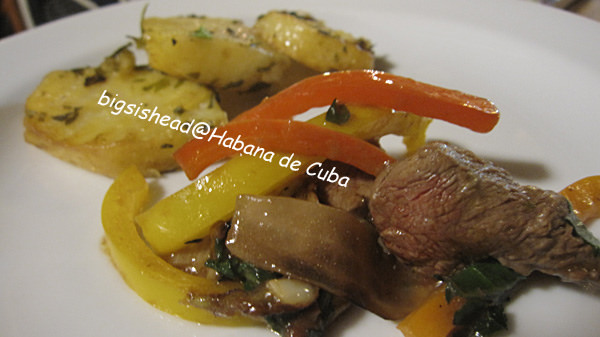 這道菜有馬鈴薯、牛肉、黃椒、紅椒及青菜。