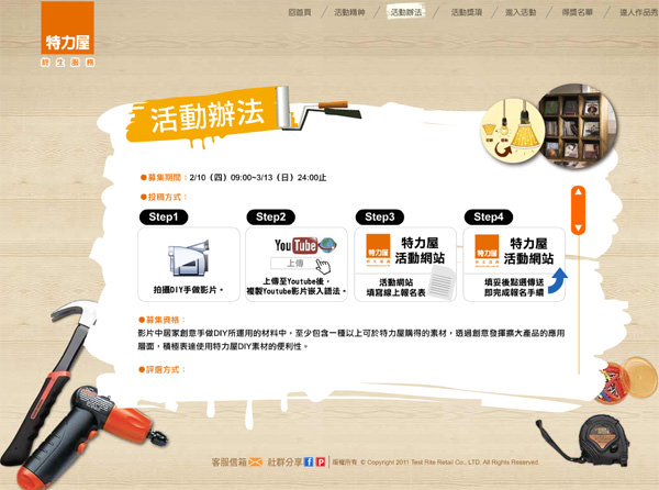 活動方法很簡單,只需要將你製作過程拍成影片,上傳到youtube,填寫特力屋活動網站的報名表即可。