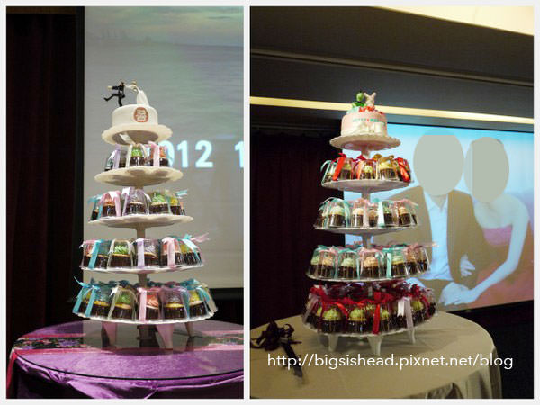 杯子蛋糕挺適合用在婚禮場合,可以彌補賓客只能看切蛋糕儀式無法吃到蛋糕的遺憾。也感謝左邊杯子蛋糕塔那場新人送給我們主持團隊杯子蛋糕,讓阿冠有機會嘗鮮,進而想到拿來當拜拜的哏,哈哈!