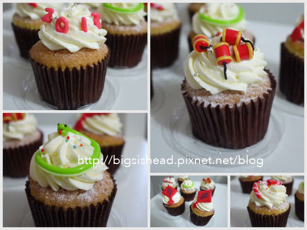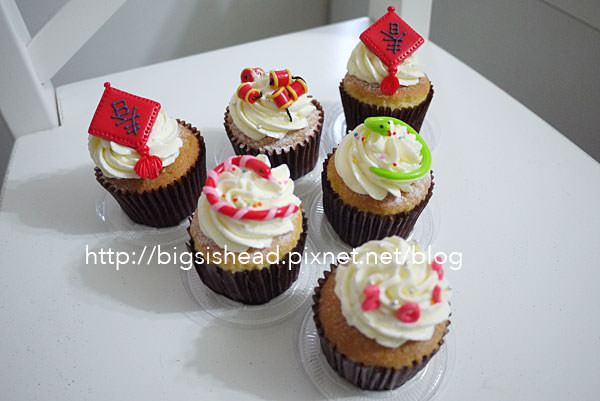 一打開來拍照,整個蛋糕香味撲鼻而來,我的媽呀!可是我要忍到明天拜拜完才能吃(忍~~~)!MooQ杯子蛋糕有全奶油或全翻糖的款式,但我不喜歡只吃翻糖,太甜了,MooQ的奶油正因為我之前吃過覺得不甜膩,所以才會想買,不過單純靠奶油又做不出這些圖案,所以選擇奶油上方擺一些小翻糖當做圖案的款式。
