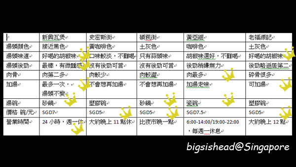 最後來評比一下,阿冠心目中的第一名是新興瓦煲,第二名老福源記,第三名黃亞細,第四名史密斯街路邊攤,最後一名是碩莪街。第一二名都位在加東區,既然都去了就一塊吃吧!第三名如果要吃本店,我個人是覺得先走多一點的路讓自己餓一點再吃也是不錯啦!如果不想要走那麼遠,可以到金沙濱海灣的分店去吃吧!最後一名,千萬不要再去踩地雷了。