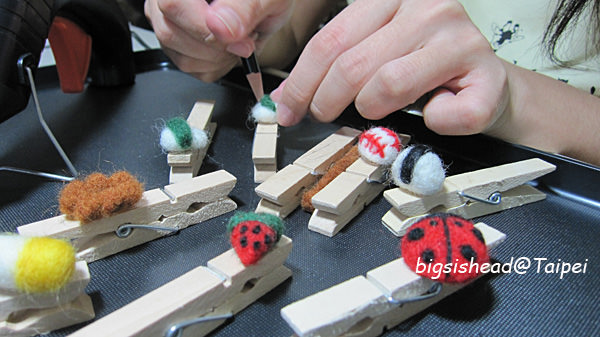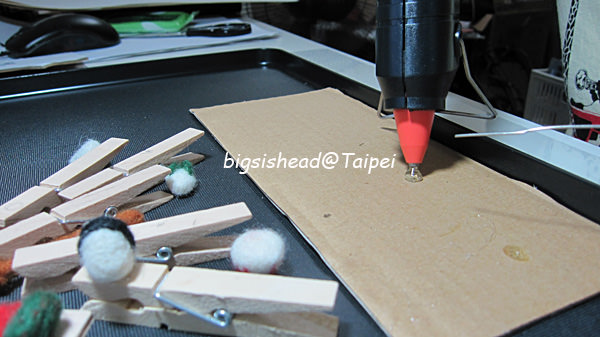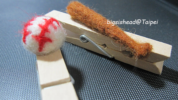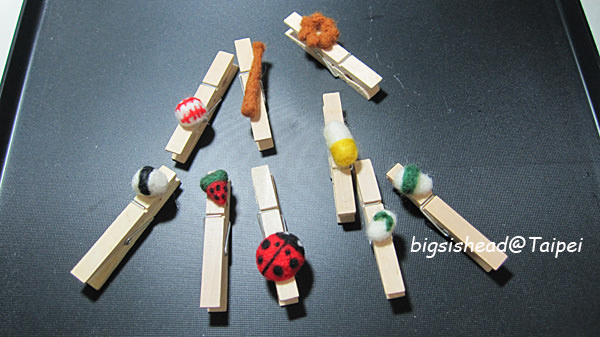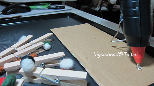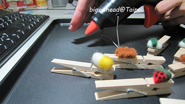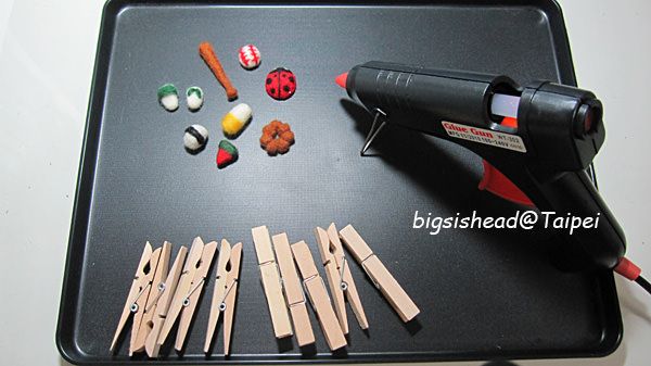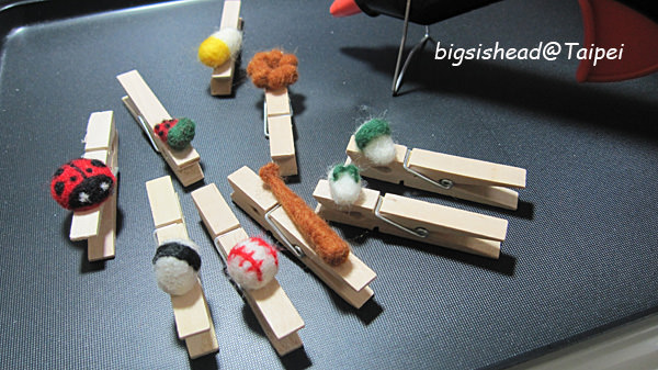 今日準備材料:已經事先手工加工的羊毛氈小玩意、九支木夾及熱熔槍(條)一支。