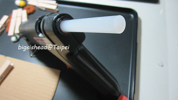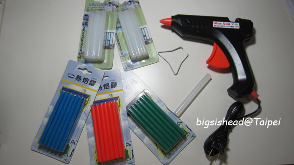 可是我的大支熱熔槍,適用大的熱熔膠條,蹺屁股拿了三組彩色的熱熔膠條根本用不上呀!回鄉跟冠爸借小支的熱熔槍才能用。