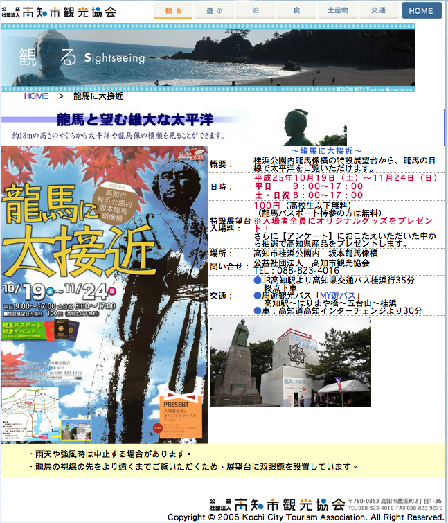 今年年初阿冠有分享高知縣特別搭了一個平台可以近距離的接近龍馬,還能用接近龍馬的視角凝望大海喔!20131019-20131124再一波期間限定,上次沒來得及看的朋友,這次可以好好安排一下喔! (圖片來源:高知市觀光協會) 今天早上阿冠剛好在官網上看到這個訊息,超興奮,可惜限定時間內無法前往,不過還是要分享給大家這個訊息。 20130420-20130512,高知縣特別搭了一個平台可以近距離的接近 […]…