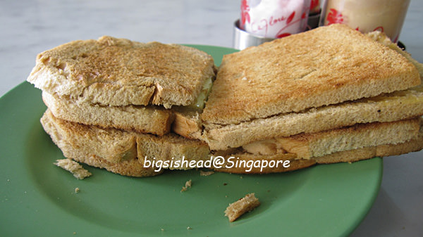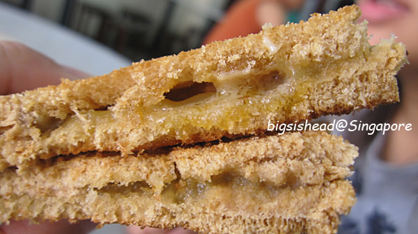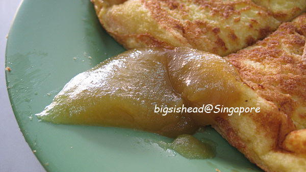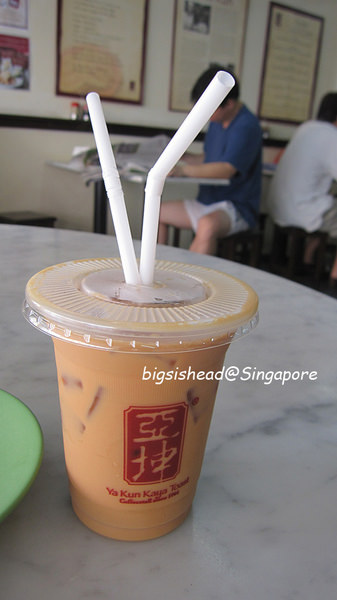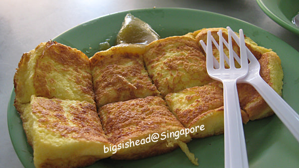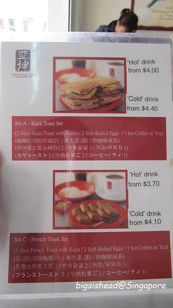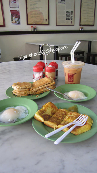 今日的餐點:A套餐(咖椰土司加牛油兩片、養生蛋兩粒、奶茶–冰的+0.4元),另外單點一份法式土司加咖椰(SGD6.1)。