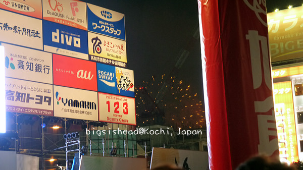 ●8/9晚上是よさこい祭り(YOSAKOI)前夜祭,由前一年得獎的團體在中央公園舞台區表演炒熱氣氛,並且在鏡川畔有煙火的表演。我們因為時間的關係沒到鏡川畔看煙火,不過,在中央公園看表演時也有一小角的天空可以同步看煙火,哈哈!這樣有算打卡做到功課了吧!