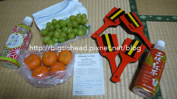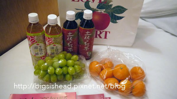 一份英文留言、好吃的水果、旅人最需要的瓶裝水、經典的代表性禮物,看似簡單的禮物,樣樣都很用心,高知人的熱情及貼心,令人難忘!